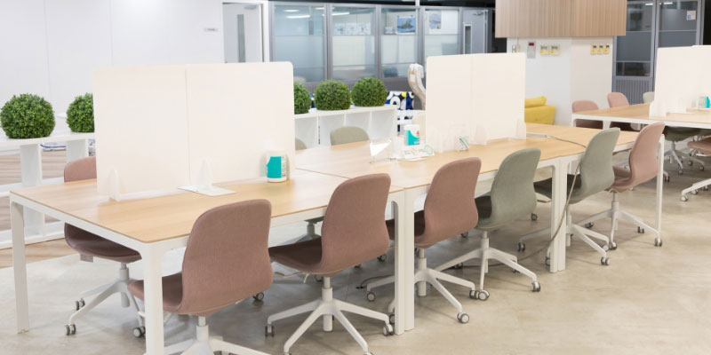 フリーアドレスは従業員の席の位置を固定せず、自由に場所を選んで仕事をするスタイルになります。長机やソファセットや立ち姿勢など様々な形があります。自由に場所を選ぶということで部署間を超えた社内コミュニケーションが活性化したり、省スペース化などのメリットがあります。人との距離は近くなりますが、同時に一人で集中するエリアを設けることも可能です。