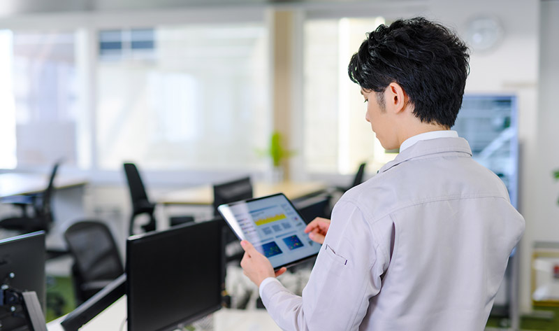 イシマル五島の社内オフィスは、「昨日座った席に座らない」をルールとし、ABW(Activity Based Working)を採用。業務内容に合わせ、自ら働く場所を選ぶワークスタイルです。また、DX推進において、SFA(営業活動の管理システム)、ビジネスチャット、スマホ内線化など積極的に導入しております。